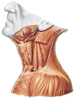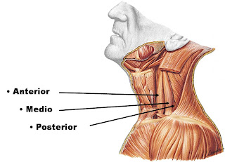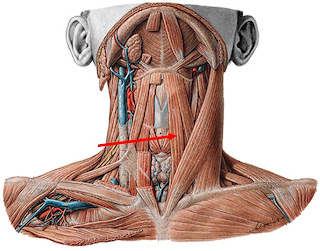 Está ubicado sobre las músculos anteriores, él extiende la columna cervical y la inclina hacia un lado.